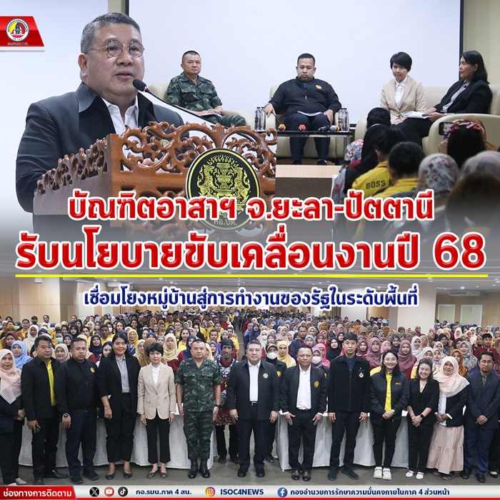 วันนี้ 22 มกราคม 2568 ที่ห้องประชุมชั้น 2 ศูนย์ราชการจังหวัดชายแดนภาคใต้ อำเภอเมือง จังหวัดยะลา พันเอก อนุชา โนนคู่เขตโขง รองเลขาธิการ กองอำนวยการรักษาความมั่นคงภายในภาค 4 ส่วนหน้า ร่วมเป็นเกียรติและร่วมเสวนา ในการประชุมเชิงปฏิบัติการมอบนโยบายและขับเคลื่อนการดำเนินงานบัณฑิตอาสาพัฒนามาตุภูมิ 5 จชต. ประจำปีงบประมาณ 2568 ซึ่งมี พันตำรวจโท วรรณพงษ์ คชรักษ์ เลขาธิการศูนย์อำนวยการบริหารจังหวัดชายแดนภาคใต้ เป็นประธานในพิธีฯ พร้อมมอบเกียรติบัตรให้แก่บัณฑิตอาสาพัฒนามาตุภูมิดีเด่น โดยมี พันโท เชิด อักษรรัตน์ ผู้อำนวยการกองประสานและเร่งรัดการพัฒนาพื้นที่พิเศษจังหวัดชายแดนภาคใต้ และบัณฑิตอาสาฯ จังหวัดยะลา และปัตตานีจำนวน 1,011 คน เข้าร่วม
