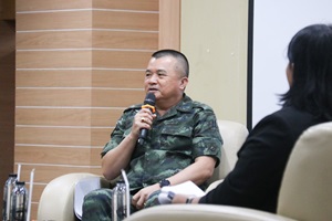 โอกาสนี้ พันเอก อนุชา โนนคู่เขตโขง รองเลขาธิการ กองอำนวยการรักษาความมั่นคงภายในภาค 4 ส่วนหน้า ได้ร่วมเสวนาทางวิชาการ ในหัวข้อ ทิศทางการแก้ไขปัญหาและพัฒนาจังหวัดชายแดนภาคใต้ ”ในมิติด้านความมั่นคง“ ได้กล่าวตอนหนึ่งว่า บัณฑิตอาสาพัฒนามาตูภูมิทุกคนคือพลังทางความคิด และเจ้าหน้าที่รัฐทุกส่วนเป็นพลังที่มีประสิทธิภาพ ที่จะร่วมกันแก้ไขปัญหา เพราะปัญหาจังหวัดชายแดนภาคใต้เป็นปัญหาที่ซับซ้อน ฉะนั้นทุกคนในพื้นที่จะเข้าใจปัญหาและจะต้องร่วมมือกัน สำหรับมิติด้านความมั่นคง กองอำนวยการรักษาความมั่นคงภายในภาค 4 ส่วนหน้า มีแนวทาง “สร้างความเข้าใจ ร่วมใจแก้ไขปัญหา นำพาสันติสุข” โดยขับเคลื่อนภารกิจงาน 5 ด้าน คือ การควบคุมพื้นที่ไม่ให้เกิดเหตุการบังคับใช้กฎหมาย การป้องกันและแก้ไขปัญหายาเสพติด การส่งเสริมและการอยู่ร่วมกันภายใต้สังคมพหุวัฒนธรรมที่เข้มแข็ง การสร้างความเข้าใจ และการบูรณาการด้านความมั่นคงและการพัฒนา