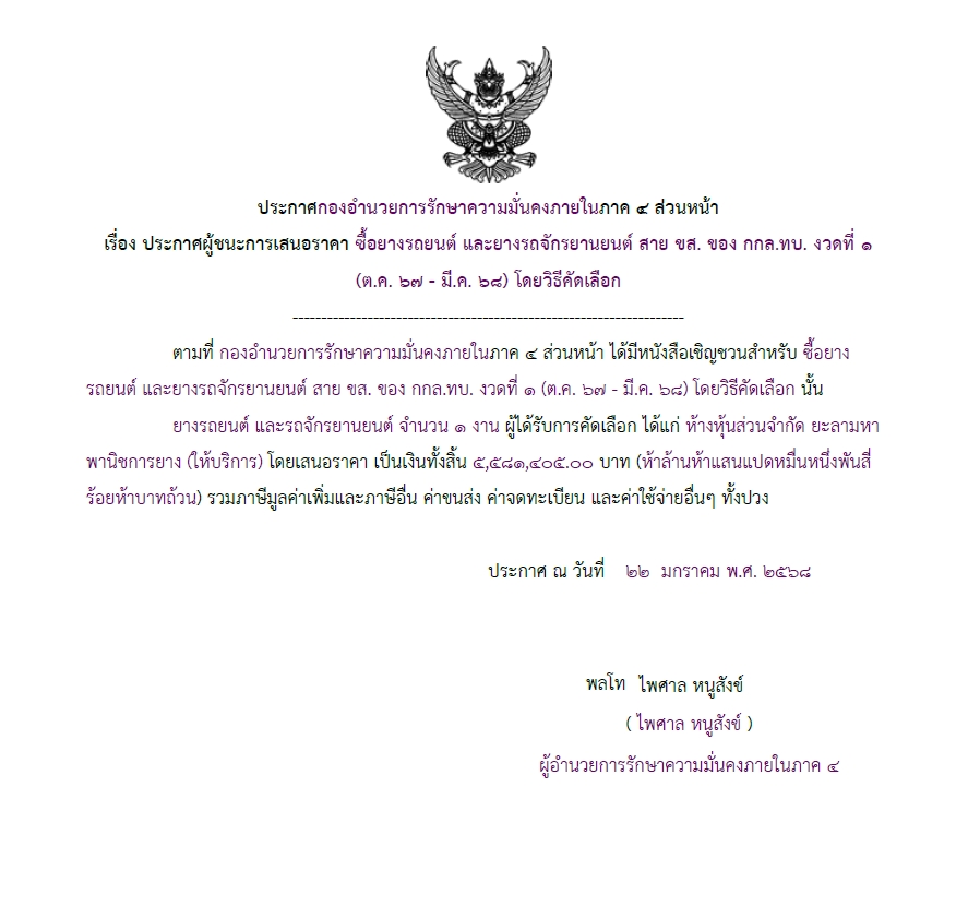 จัดซื้อ จัดจ้างประกาศผู้ชนะการเสนอราคา ประกาศผู้ชนะการเสนอราคา ซื้อยางรถยนต์ และยางรถจักรยานยนต์ สาย ขส. ของ กกล.ทบ. งวดที่ ๑ (ต.ค. ๖๗ – มี.ค. ๖๘) โดยวิธีคัดเลือก January 22, 2025 269 Share Facebook Twitter Google+ Telegram LINE