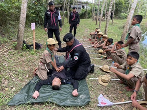 The 22nd Ranger Regiment, by the 2206th Ranger Company, organized a joint effort in the Scout and Guide Camp at Ban Inthanin School, Village 5, Jara Bongoh, Khao Tum Subdistrict, Yarang District, Pattani Province. The purpose was to enhance students’ knowledge and skills in the area through training in basic first aid and assisting injured individuals. Four key training stations were set up: the Formation Station, the Mental Strength Test Station, the Basic First Aid Station, and the Wilderness Survival Station.