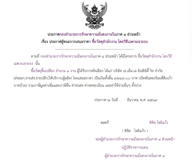 ประกาศผู้ชนะการเสนอราคา ซื้อวัสดุสำนักงาน โดยวิธีเฉพาะเจาะจง