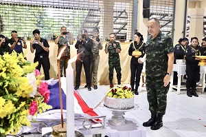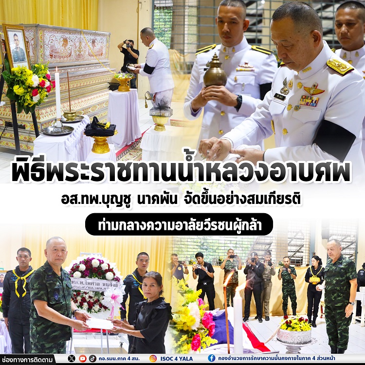จากเหตุการณ์คนร้ายไม่ทราบจำนวนลอบวางระเบิด ชุดรักษาความปลอดภัยเส้นทาง กองร้อยทหารพรานที่ 4511 ขณะทำการลาดตระเวนเส้นทาง บริเวณศาลาปฏิบัติธรรม บ้านจุฬาภรณ์พัฒนา 5 หมู่ 9 ตำบลบองอ อำเภอระแงะ จังหวัดนราธิวาส เป็นเหตุให้กำลังพลเสียชีวิต 1 นาย คือ อาสาสมัครทหารพราน บุญชู นาคพัน เจ้าหน้าที่ชุดปฏิบัติการที่ 2 กองร้อยทหารพรานที่ 4511 หน่วยเฉพาะกิจกรมทหารพรานที่ 45 เมื่อวันที่ 23 มกราคม 2568 ที่ผ่านมา ในวันนี้ (24 มกราคม 2568) เวลา 14.30 น. ที่ ฌาปนสถานเทศบาลนครยะลา ตำบลสะเตง อำเภอเมือง จังหวัดยะลา พลตรี พิชิต โชติแก้ว รองผู้อำนวยการรักษาความมั่นคงภายในภาค 4 ส่วนหน้า เป็นประธานในพิธีอัญเชิญน้ำหลวงอาบศพแก่อาสาสมัครทหารพราน บุญชู นาคพัน เจ้าหน้าที่ชุดปฏิบัติการที่ 2 กองร้อยทหารพรานที่ 4511 หน่วยเฉพาะกิจกรมทหารพรานที่ 45 โดยมี พลตรี เฉลิมพร ขำเขียว ผู้บัญชาการกองพลทหารราบที่ 15/ ผู้บังคับหน่วยเฉพาะกิจนราธิวาส/ผู้บังคับกองบังคับการควบคุมสุริโยทัย , ผู้แทนหน่วยเฉพาะกิจในพื้นที่ , ผู้แทนศูนย์อำนวยการบริหารจังหวัดชายแดนภาคใต้, คณะผู้บังคับบัญชา, ส่วนราชการ, เจ้าหน้าที่ทหาร, ตำรวจ ตลอดจนประชาชนในพื้นที่ร่วมพิธีแสดงความเคารพและอาลัยแก่วีรชนทหารกล้า ยังความปลื้มปิติในพระมหากรุณาธิคุณแก่ครอบครัวนาคพัน และเพื่อนทหารเป็นล้นพ้น