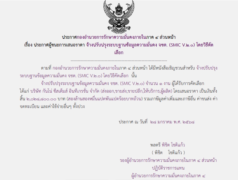 ประกาศผู้ชนะการเสนอราคา จ้างปรับปรุงระบบฐานข้อมูลความมั่นคง จชต. (SMIC V.๒.๐) โดยวิธีคัดเลือก