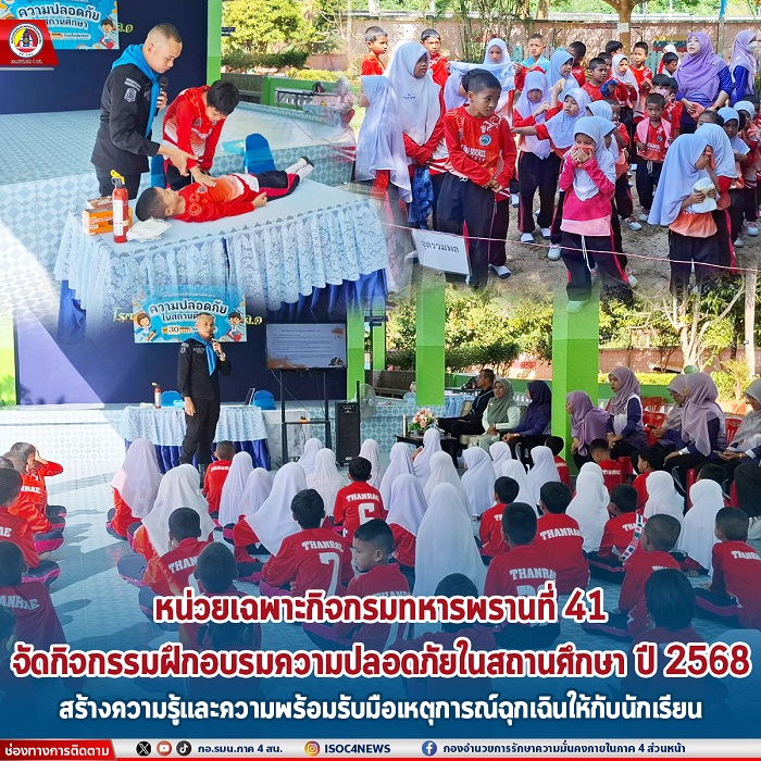 วันที่ 30 มกราคม 2568 เวลา 09.00 น. หน่วยเฉพาะกิจกรมทหารพรานที่ 41 ได้จัดกำลังพลชุดปฏิบัติการกิจการพลเรือน กองร้อยทหารพรานที่ 4103 ร่วมกับผู้อำนวยการสถานศึกษา, คณะครูและบุคลากรทางการศึกษา พร้อมนักเรียน จัดกิจกรรมฝึกอบรมให้ความรู้เกี่ยวกับความปลอดภัยในสถานศึกษา ตามโครงการประจำปี 2568 โดยในกิจกรรมครั้งนี้ ได้จำลองเหตุการณ์การเกิดอัคคีภัย เพื่อซักซ้อมแผนเผชิญเหตุให้กับนักเรียน ซึ่งจะช่วยให้เด็กนักเรียนได้เรียนรู้วิธีการเอาตัวรอดในสถานการณ์จริงได้อย่างถูกต้องและปลอดภัย ณ โรงเรียนธารแร่ หมู่ที่ 1 ตำบลกาลอ อำเภอรามัน จังหวัดยะลา