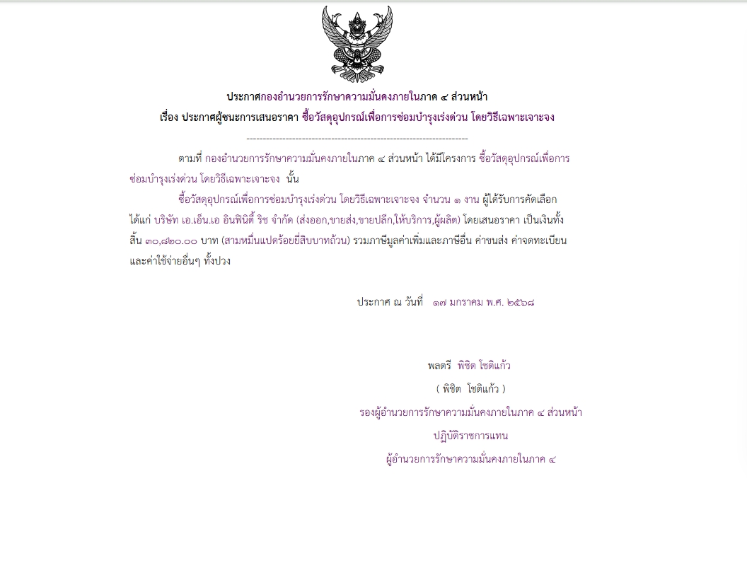 ประกาศผู้ชนะการเสนอราคา ซื้อวัสดุอุปกรณ์เพื่อการซ่อมบำรุงเร่งด่วน โดยวิธีเฉพาะเจาะจง