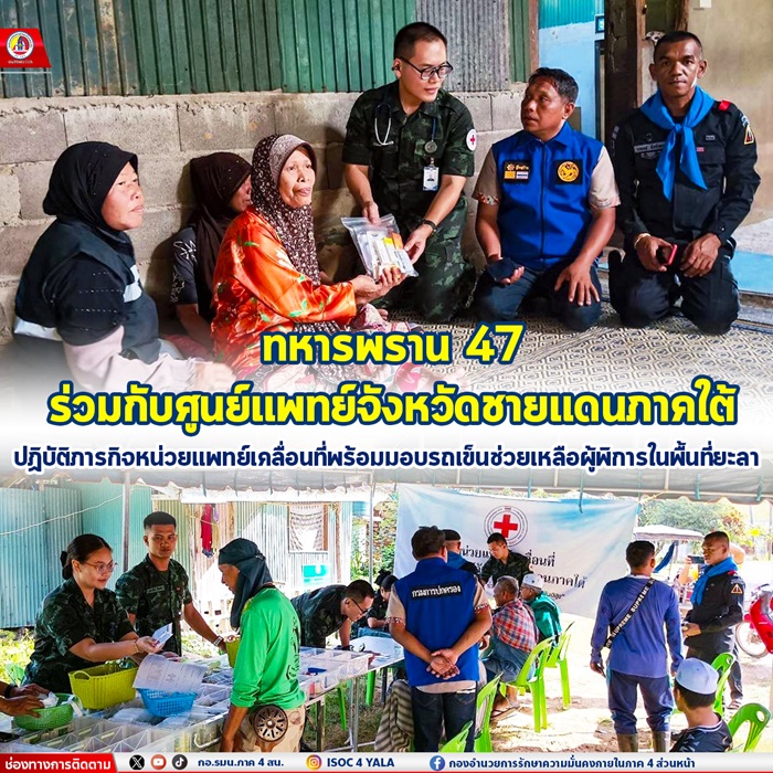 เมื่อวันที่ 31 มกราคม 2568 หน่วยเฉพาะกิจกรมทหารพรานที่ 47 ร่วมกับผู้นำท้องที่, อาสาสมัครสาธารณสุขประจำหมู่บ้าน (อสม.) หมู่ที่ 4 ตำบลบาโร๊ะ และศูนย์แพทย์จังหวัดชายแดนภาคใต้ ได้ออกปฏิบัติภารกิจหน่วยแพทย์เคลื่อนที่, ทันตกรรมเคลื่อนที่ และฝึกสอนการช่วยชีวิตขั้นพื้นฐาน พร้อมให้ความรู้เกี่ยวกับโรคมาลาเรีย ณ ป้อมชุดรักษาความปลอดภัยหมู่บ้าน หมู่ที่ 4 ตำบลบาโร๊ะ อำเภอยะหา จังหวัดยะลา โดยภารกิจนี้ได้ทำการเยี่ยมผู้พิการในพื้นที่ และมอบรถเข็นวีลแชร์ จำนวน 1 คัน ให้แก่ผู้พิการ 2 ราย ได้แก่