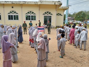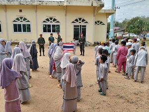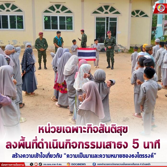 เมื่อวันที่ 2 กุมภาพันธ์ 2568 หน่วยเฉพาะกิจสันติสุข โดย ชุดสันติสุขที่ 505 ร่วมกับ ชุดทักษิณสัมพันธ์ที่ 551 กองร้อยทหารราบที่ 5024 ได้จัดกิจกรรมเสาธง 5 นาที ณ ศูนย์การศึกษาอิสลามประจำมัสยิดซีอารุล (ตาดีกาบ้านควนหรันเหนือ) บ้านควนหรัน หมู่ที่ 2 ตำบลเปียน อำเภอสะบ้าย้อย จังหวัดสงขลา โดยมุ่งเน้นการสร้างการรับรู้และปลูกฝังอุดมการณ์ความรักชาติ ศาสนา และสถาบันพระมหากษัตริย์ให้กับนักเรียนในสถานศึกษา