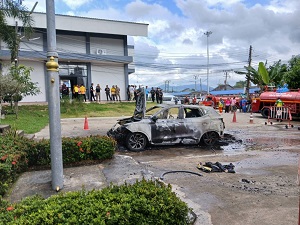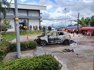 สำหรับเหตุการณ์ที่สอง เกิดขึ้นเมื่อเวลาประมาณ 09.20 น. ได้เกิดเหตุระเบิดบริเวณลานจอดรถภายในที่ว่าการอำเภอยี่งอ จังหวัดนราธิวาส บริเวณหน้ากองร้อยอาสารักษาดินแดนอำเภอยี่งอ จากการตรวจสอบเบื้องต้นเป็นการระเบิดจากรถยนต์ประกอบระเบิดแสวงเครื่อง โดยจากการระเบิด ทำให้เกิดเพลิงไหม้รถยนต์คันดังกล่าว เจ้าหน้าที่ดับเพลิงจึงเข้าควบคุมสถานการณ์และตรวจสอบที่เกิดเหตุ พบว่ารถที่ถูกเพลิงไหม้เป็นรถยนต์ยี่ห้อ MG ของปลัดอำเภอยี่งอ