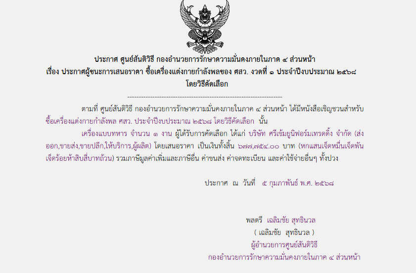 ประกาศผู้ชนะการเสนอราคา ซื้อเครื่องแต่งกายกำลังพลของ ศสว. งวดที่ ๑ ประจำปีงบประมาณ ๒๕๒๕๖๖๘ โดยวิธีคัดเลือก
