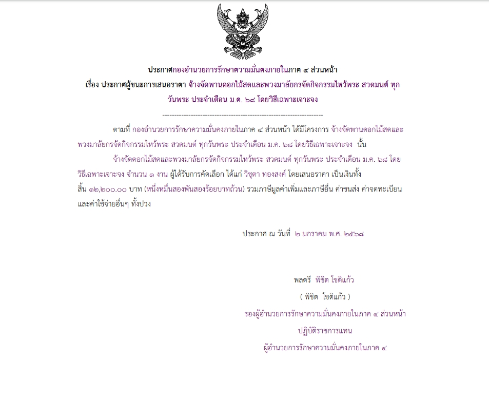 จัดซื้อ จัดจ้างประกาศผู้ชนะการเสนอราคา ประกาศผู้ชนะการเสนอราคา จ้างจัดพานดอกไม้สดและพวงมาลัยกรจัดกิจกรรมไหว้พระ สวดมนต์ ทุก วันพระ ประจำเดือน ม.ค. ๖๘ โดยวิธีเฉพาะเจาะจง February 6, 2025 203 Share Facebook Twitter Google+ Telegram LINE