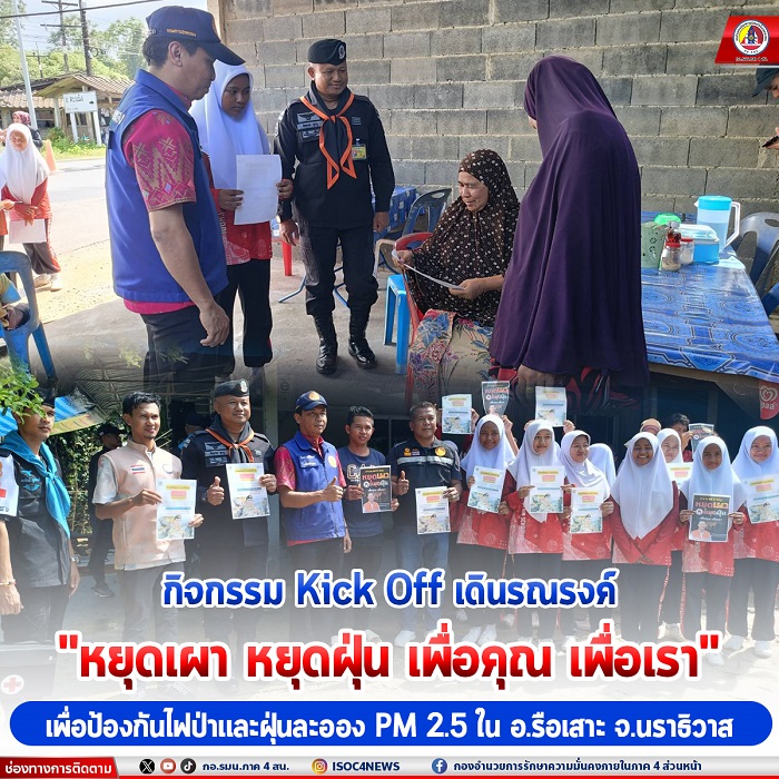 Pada 5 Februari 2568, jam 09.00 pagi, Unit Taktikal Tentera Perbatasan Ke-46 mengadakan program bersama dengan agensi kerajaan di daerah Rueso, Narathiwat untuk melancarkan kempen Kick Off di bawah slogan “Berhenti Membakar, Berhenti Debu Untuk Anda, Untuk Kami”. Tujuan utama kempen ini adalah untuk mencegah dan mengurangkan masalah jerebu, kebakaran hutan, dan debu halus PM 2.5 yang memberi kesan buruk terhadap kesihatan penduduk. Ia menekankan agar penduduk di kawasan ini berhati-hati dan menghentikan semua bentuk pembakaran, terutamanya dalam tempoh 90 hari yang dianggap berisiko tinggi untuk kebakaran hutan dan pengumpulan debu PM 2.5. Tentera Perbatasan turut bertemu dengan masyarakat setempat dan memberi penerangan tentang pentingnya kerjasama untuk menyelesaikan masalah ini.