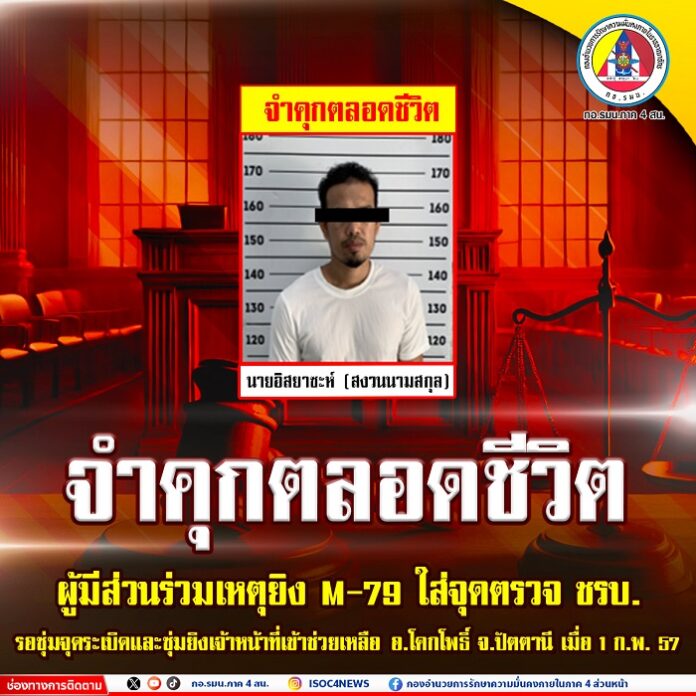 Life imprisonment for those involved in the M-79 shooting incident at a checkpoint, setting up explosive devices, and ambushing officers who went to assist in Ko Khor District, Pattani on February 1, 2014.