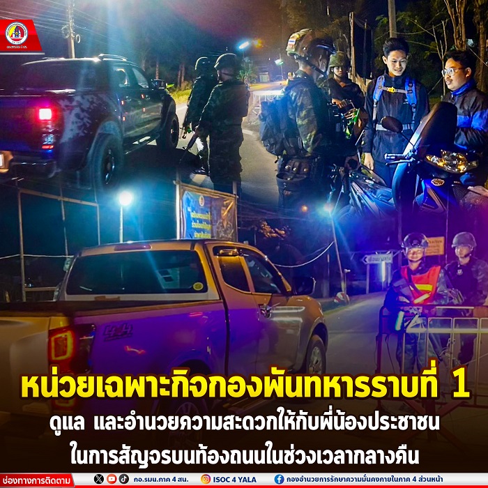 วันที่ 9 – 10 กุมภาพันธ์ 2568 ที่ผ่านมา หน่วยเฉพาะกิจกองพันทหารราบที่ 1 (ฉก.พัน.ร.ที่ 1) ได้ดำเนินการตามแผนการปฏิบัติการ POP UP เพื่อเสริมสร้างความปลอดภัยและอำนวยความสะดวกให้กับประชาชนในการสัญจรบนท้องถนนในช่วงเวลากลางคืน ตั้งแต่เวลา 18.30 น. ของวันที่ 9 กุมภาพันธ์ ไปจนถึงเวลา 06.30 น. ของวันที่ 10 กุมภาพันธ์ 2568 โดยการตั้งจุดตรวจ จุดสกัด ในเขตพื้นที่อำเภอบันนังสตา จังหวัดยะลา และอำเภอยะรัง จังหวัดปัตตานี เพื่อดูแลความปลอดภัยของประชาชน รวมถึงการป้องกันและยับยั้งการกระทำผิดกฎหมายต่าง ๆ โดยเฉพาะการขนย้ายสิ่งของผิดกฎหมายและสารเสพติด ตามถนนสายหลักและสายรองภายในพื้นที่ รวมทั้งการเฝ้าระวังบุคคลภายนอกที่อาจเดินทางเข้ามาในพื้นที่เพื่อหลีกเลี่ยงเหตุการณ์ไม่คาดฝัน