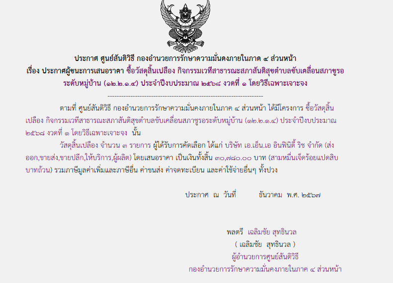 จัดซื้อ จัดจ้างประกาศผู้ชนะการเสนอราคา ประกาศผู้ขนะการเสนอราคา ซื้อวัสดุสิ้นเปลือง กิจกรรมเวทีสาธารณะสภาสันติสุขตำบลขับเคลื่อนสภาชูรอ ระดับหมู่บ้าน (๑๒.๒.๑.๔) ประจำปีงบประมาณ ๒๕๖๘ งวดที่ ๑ โดยวิธีเฉพาะเจาะจง February 12, 2025 223 Share Facebook Twitter Google+ Telegram LINE