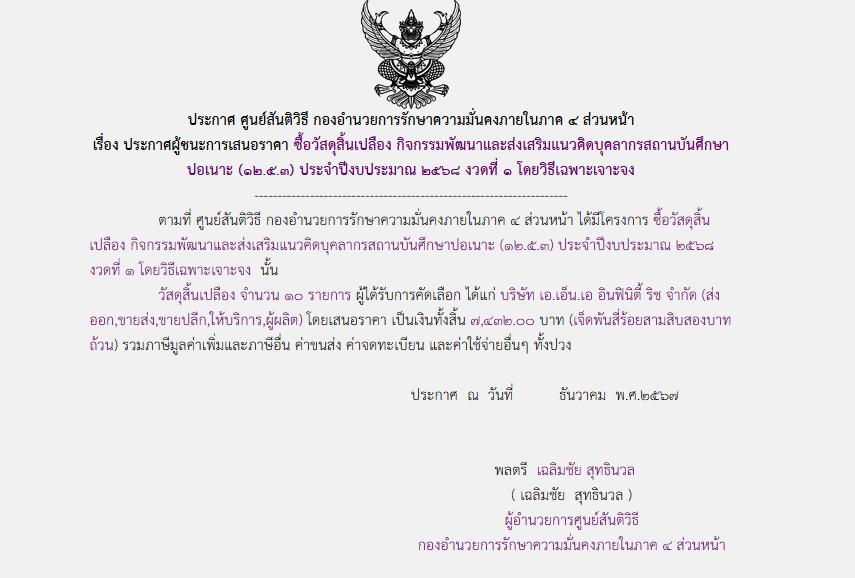 จัดซื้อ จัดจ้างประกาศผู้ชนะการเสนอราคา ประกาศผู้ชนะการเสนอราคา ซื้อวัสดุสิ้นเปลือง กิจกรรมพัฒนาและส่งเสริมแนวคิดบุคลากรสถานบันศึกษา ปอเนาะ (๑๒.๕.๓) ประจำปึงบประมาณ ๒๕๖๘ งวดที่ ๑ โดยวิธีเฉพาะเจาะจง February 12, 2025 167 Share Facebook Twitter Google+ Telegram LINE