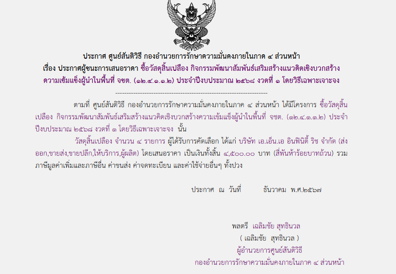 จัดซื้อ จัดจ้างประกาศผู้ชนะการเสนอราคา ประกาศผู้ชนะการเสนอราคา ซื้อวัสดุสิ้นเปลือง กิจกรรมพัฒนาสัมพันธ์เสริมสร้างแนวคิดเชิงบวกสร้าง ความเข้มแข็งผู้นำในพื้นที่ จชต. (๑๒.๔.๑.๑.๒) ประจำปึงบประมาณ ๒๕๖๘ งวดที่ ๑ โดยวิธีเฉพาะเจาะจง February 12, 2025 187 Share Facebook Twitter Google+ Telegram LINE