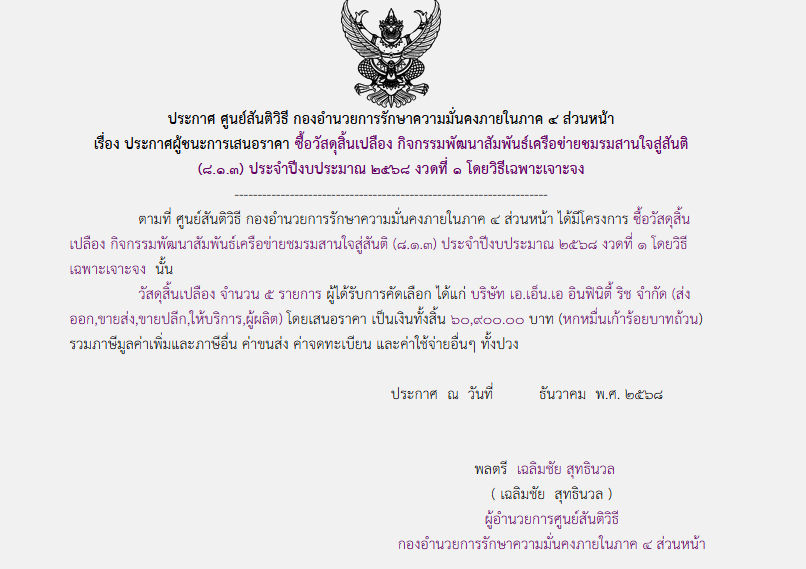 จัดซื้อ จัดจ้างประกาศผู้ชนะการเสนอราคา ประกาศผู้ชนะการเสนอราคา ซื้อวัสดุสิ้นเปลือง กิจกรรมพัฒนาสัมพัมพันธ์เครือข่ายชมรมสานใจสู่สันติ (๘.๑.๓) ประจำปิ๊งบประมาณ ๒๕๖๘ งวดที่ ๑ โดยวิธีเฉพาะเจาะจง February 12, 2025 202 Share Facebook Twitter Google+ Telegram LINE