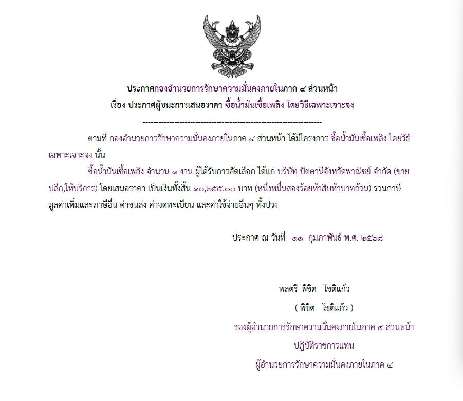 ประกาศผู้ชนะการเสนอราคา ซื้อน้ำมันเชื้อเพลิง โดยวิธีเฉพาะเจาะจง