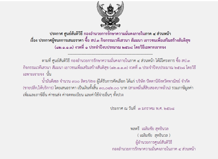 จัดซื้อ จัดจ้างประกาศผู้ชนะการเสนอราคา ประกาศผู้ชนะการเสนอราคา ซื้อ สป.๓ กิจกรรมเวทีเสวนา สัมมนา เยาวชนเพื่อเสริมสร้างสันติสุข (๑๒.๑.๑.๓) งวดที่ ๑ ประจำปีงบประมาณ ๒๕๖๘ โดยวิธีเฉพาะเจาะจง February 12, 2025 316 Share Facebook Twitter Google+ Telegram LINE