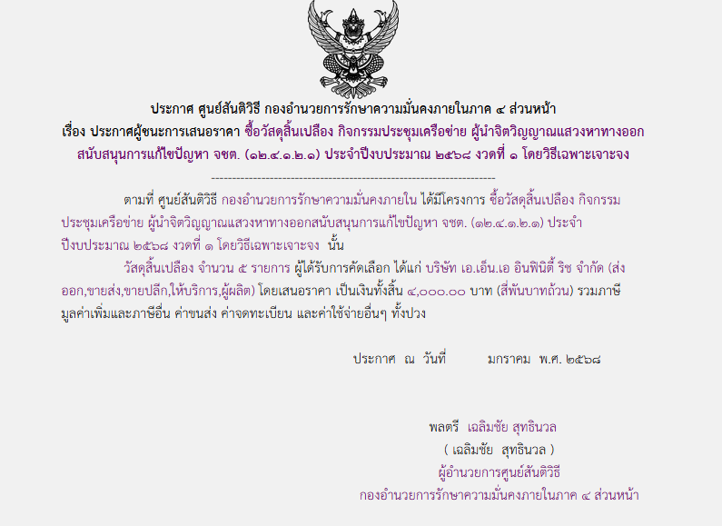จัดซื้อ จัดจ้างประกาศผู้ชนะการเสนอราคา ประกาศผู้ชนะการเสนอราคา ซื้อวัสดุสิ้นเปลือง กิจกรรมประชุมเครือข่าย ผู้นำจิตวิญญาณแสวงหาหาทางออก สนับสนุนการแก้ไขปัญหา จขต. (๑๒.๔.๘.๒.e) ประจำปีงบประมาณ ๒๕๖๘ งวดที่ ๑ โดยวิธีเฉพาะเจาะจง February 12, 2025 281 Share Facebook Twitter Google+ Telegram LINE