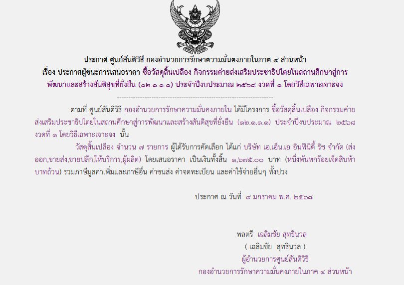 จัดซื้อ จัดจ้างประกาศผู้ชนะการเสนอราคา ประกาศผู้ชนะการเสนอราคา ซื้อวัสดุสิ้นเปลือง กิจกรรมค่ายส่งเสริมประชาธิปไตยในสถานศึกษาสู่การ พัฒนาและสร้างสันติสุขที่ยั่งยืน (๑๒.๑.๑.๐) ประจำปีงบประมาณ ๒๕๖๘ งวดที่ ๑ โดยวิธีเฉพาะเจาะจง February 12, 2025 350 Share Facebook Twitter Google+ Telegram LINE