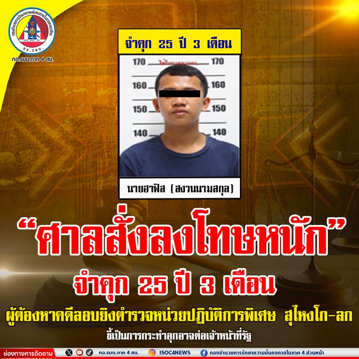 The court imposes a heavy sentence of 25 years and 3 months imprisonment on the suspect in the case of the ambush shooting of a special operations police officer in Su-ngai Kolok, ruling it as an egregious act against a public official.
