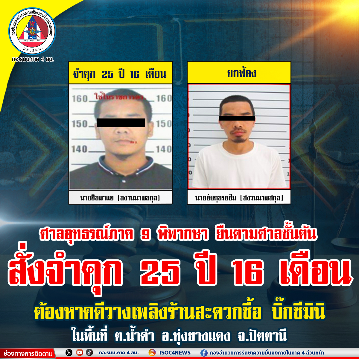 Mahkamah Rayuan Wilayah 9 mengekalkan keputusan mahkamah peringkat pertama dengan menjatuhkan hukuman penjara selama 25 tahun 16 bulan kepada tertuduh dalam kes pembakaran kedai serbaneka Big C Mini di kawasan Kampung Nam Dam, Daerah Thung Yang Daeng, Pattani.