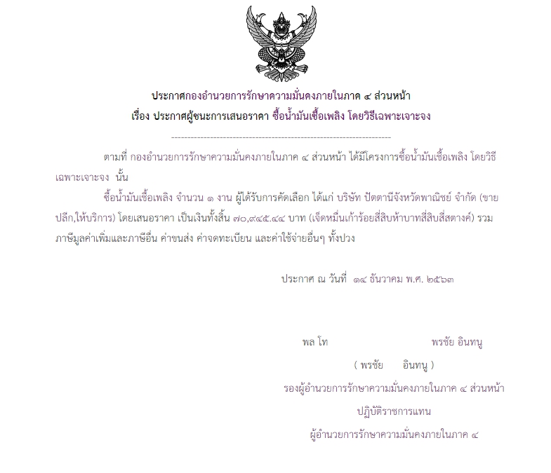 ประกาศผู้ชนะการเสนอราคา ซื้อน้ำมันเชื้อเพลิง โดยวิธีเฉพาะเจาะจง (70,945.44)