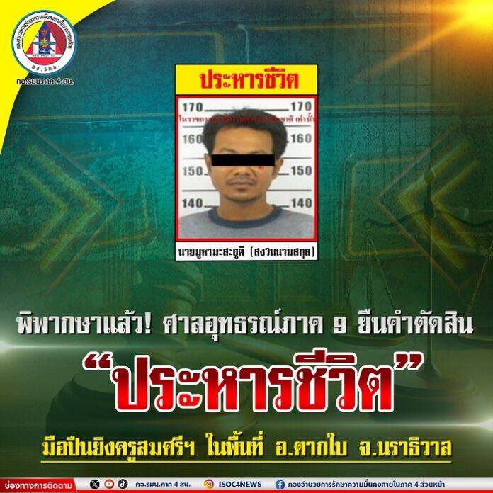 และต่อมมาเมื่อวันที่ 27 ตุลาคม 2566 ศาลจังหวัดนราธิวาส อ่านคำพิพากษาศาลอุทธรณ์ภาค 9 พิพากษา ยืนตามศาลชั้นต้น “ประหารชีวิตสถานเดียว” นายมูหามะสะอูดี (สงวนนามสกุล) จำเลย ความผิดฐานก่อการร้าย อั้งยี่ ซ่องโจร ความผิดต่อชีวิต พ.ร.บ.อาวุธปืนฯ เนื่องจากพยานหลักฐาน คือ กล้องวงจรปิด CCTV บันทึกภาพคนร้ายที่ก่อเหตุได้ชัดเจน อีกทั้งปลอกกระสุนปืนและอาวุธปืนที่ตกในที่เกิดเหตุ ซึ่งเป็นพยานวัตถุ เชื่อได้ว่าจำเลยคือหนึ่งในคนร้ายที่ร่วมก่อเหตุในคดีนี้ ประกอบกับคำรับสารภาพของจำเลยทำให้ศาลเชื่อว่าจำเลยคือคนร้ายในคดีนี้จริง (ขังจำเลยระหว่างฎีกา อ.470/65)