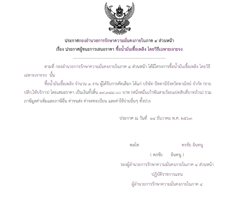 จัดซื้อ จัดจ้างประกาศผู้ชนะการเสนอราคา ประกาศผู้ชนะการเสนอราคา ซื้อน้ำมันเชื้อเพลิง โดยวิธีเฉพาะเจาะจง (19,384.00) January 4, 2021 908 Share Facebook Twitter Google+ Telegram LINE สกบ.กอ.รมน.ภาค 4 สน.