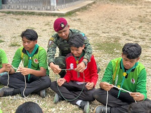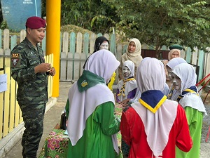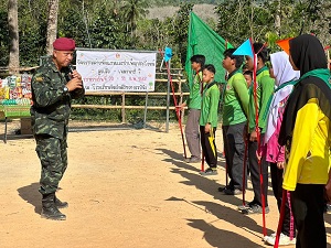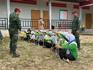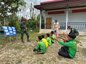The Special Task Force for Santi Suk, led by Control Unit 953 and Santi Suk Unit 305, along with the Taksin Sampan Unit 331, organized Scout and Guide camp activities at Jitphakdee Witthaya School, Grong Pinang, Grong Pinang District, Yala Province. The aim was to enhance understanding and develop skills among the youth in the area. The activities included Scout skill training in three stations: basic first aid, knot tying, and traffic regulations. In each station, students had the opportunity to learn from military personnel, who are experts in each field. The training received strong interest from the students, with approximately 100 participants.
