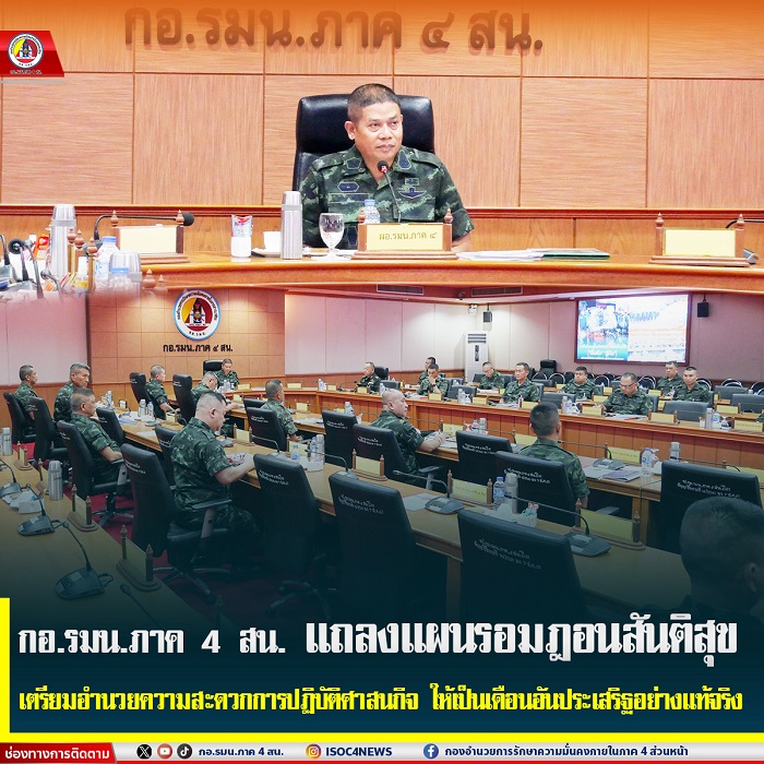 พลโท ไพศาล หนูสังข์ แม่ทัพภาคที่ 4 / ผู้อำนวยการรักษาความมั่นคงภายในภาค 4 กล่าวว่า “วันนี้ถือเป็นโอกาสสำคัญที่ทุกหน่วยได้มาร่วมกันรับฟังแนวทางการปฏิบัติ เพื่อให้เดือนรอมฎอนปี 2568 เป็นเดือนแห่งสันติสุขอย่างแท้จริง พื้นที่จังหวัดชายแดนภาคใต้ เป็นพื้นที่ที่มีความหลากหลายทางวัฒนธรรม และศาสนา ความสงบสุขและความปลอดภัยของพี่น้องประชาชนในช่วงเดือนรอมฎอน เป็นภารกิจสำคัญที่ทุกหน่วยต้องร่วมกันขับเคลื่อนอย่างเต็มขีดความสามารถ ซึ่งแผนปฏิบัติการ 4683 – รอมฎอนสันติสุข ที่จะดำเนินการในปีนี้ มีเป้าหมายชัดเจน ที่จะต้องควบคุมพื้นที่และรักษาความปลอดภัยอย่างเข้มข้น ลดช่องว่าง ลดโอกาส ลดภัยคุกคาม เสริมสร้างความร่วมมือกับทุกภาคส่วน เพื่อให้เกิดความเข้าใจและความไว้วางใจ อำนวยความสะดวกให้พี่น้องประชาชนในการปฏิบัติศาสนกิจ ภายใต้บรรยากาศที่สงบเรียบร้อย ดำเนินมาตรการเชิงรุก ป้องกันและปราบปรามกลุ่มผู้ไม่หวังดีให้ไม่สามารถเคลื่อนไหวในช่วงเวลาสำคัญนี้ ทุกหน่วยต้องควบคุมการปฏิบัติให้เป็นไปตามแผนอย่างเข้มงวด ยึดถือข้อห้ามข้อควรปฏิบัติอย่างเคร่งครัด และการควบคุมพื้นที่จะต้องมีแผนที่รัดกุม มีความรอบคอบ ในการปฏิบัติทางยุทธวิธี และมีการประสานงาน ระหว่างหน่วยงานอย่างใกล้ชิด ขอให้พึงระลึกว่าทุกหน่วย คือส่วนสำคัญ ในการขับเคลื่อนแผนงานให้เกิดผลเป็นรูปธรรม และเพื่อให้พี่น้องประชาชนทุกศาสนาในพื้นที่ได้รับความปลอดภัย และความเชื่อมั่นว่าภาครัฐพร้อมดูแลความสงบและความปลอดภัย ให้พี่น้องประชาชน“