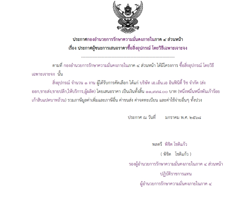 ประกาศผู้ชนะการเสนอราคาซื้อสิ่งอุปกรณ์ โดยวิธีเฉพาะเจาะจง