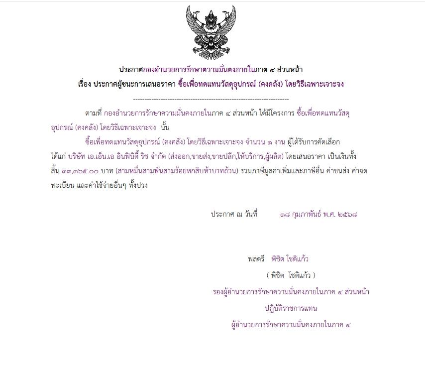 ประกาศผู้ชนะการเสนอราคา ซื้อเพื่อทดแทนวัสดุอุปกรณ์ (คงคลัง) โดยวิธีเฉพาะเจาะจง