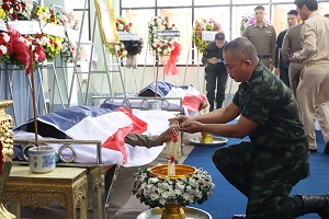 On this day (February 21, 2568), at 11:00 AM, at Wat Phutthaphum in Sateng, Muang District, Yala Province, His Majesty King Bhumibol Adulyadej graciously ordered the royal water to bathe the bodies of Sergeant Decho Khieowkaew and Sergeant Songchai Chanthraphap. The ceremony was presided over by Police Major General Wara Wechaphinun, Deputy Commander of Police Region 9, who led the royal water procession in honor of these two heroes who died while performing their duties, inspecting the area on a police motorcycle after receiving a tip from locals about drug-related activities in the alley behind the Yarang vehicle inspection center, Moo 3, Yarang District, Pattani Province. Upon reaching the location, the unknown assailants ambushed and shot the two officers, causing their deaths on the spot. The ceremony was attended by senior officials, government leaders, fellow officers, police, military, administrative personnel, family, and friends, all of whom expressed their deep sorrow.