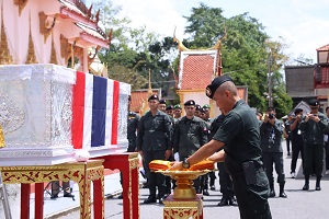 At 11:45 AM, His Majesty the King further ordered Mr. Ampon Phongsuwan, the Governor of Yala, to lay a royal wreath, along with wreaths from Her Majesty the Queen, Her Majesty the Queen Sirikit, the Queen Mother, and members of the royal family, in front of the two fallen heroes’ coffins. This gesture of royal compassion brought great pride and gratitude to the Khieowkaew family, the Chanthraphap family, and their fellow officers.