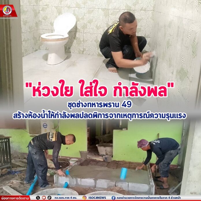 On February 20, 2025, at 08:00 AM, Colonel Phatsawit Pochada, Commander of the 49th Ranger Battalion Special Task Unit, assigned Lieutenant Pitthapob Chaisawat, Head of the Logistics Division of the 49th Ranger Battalion, to lead the unit’s engineering team in constructing a bathroom for Staff Sergeant Major Charoen Phetraphimol, a unit member who was affected by a violent incident on June 27, 2024. He was targeted by a bomb attack in the Sri Sakorn Subdistrict, Sri Sakorn District, Narathiwat Province, which resulted in Staff Sergeant Major Charoen becoming permanently disabled.