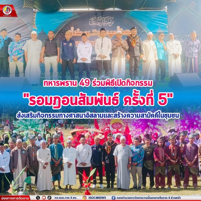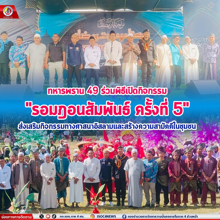 เมื่อวันที่ 22 กุมภาพันธ์ 2568 เวลา 08.00 น. พันเอก พัศวีร์ โปชะดา ผู้บังคับหน่วยเฉพาะกิจกรมทหารพรานที่ 49 ได้มอบหมายให้ ร้อยโท สุภาพ มณีฉาย ผู้บังคับกองร้อยทหารพรานที่ 4912 พร้อมด้วย จ่าสิบเอก พิพัฒน์พงศ์ ยงญาติ รองหัวหน้าชุดปฏิบัติการกิจการพลเรือนที่ 4912 เข้าร่วมพิธีเปิดกิจกรรม “รอมฎอนสัมพันธ์ ครั้งที่ 5” ระหว่างวันที่ 22 – 24 กุมภาพันธ์ 2568 ซึ่งจัดขึ้นเพื่อส่งเสริมกิจกรรมทางศาสนาอิสลามในช่วงเดือนรอมฎอน ฮิจเราะห์ศักราช 1446 กิจกรรมดังกล่าวมีวัตถุประสงค์เพื่อส่งเสริมให้เด็ก เยาวชน และประชาชนในพื้นที่ได้ปฏิบัติตามหลักคำสอนของศาสนาอิสลามอย่างถูกต้อง รวมถึงสร้างความรัก ความสามัคคี และความสัมพันธ์ฉันท์พี่น้องภายในชุมชน โดยกิจกรรมหลักคือการแข่งขันกีฬา ซึ่งมีเด็กนักเรียน เยาวชน และผู้อาวุโสเข้าร่วม