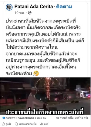 After the incident, the Facebook page called Patani Ada Cerita posted a distorted message, attempting to mislead the public into believing that the death of Mr. Tuan Ibroheng Nimi was caused by the actions of the state authorities. The post read: “The civilian who died in the explosion in Bannang Sata, was it caused by shrapnel or gunfire in a counterattack? After the explosion, there was also gunfire, but it was unclear from which direction it came. The wound on the victim seemed to resemble a gunshot hole, and the victim was farther from the explosion point compared to others who were hit by the blast.” From this statem