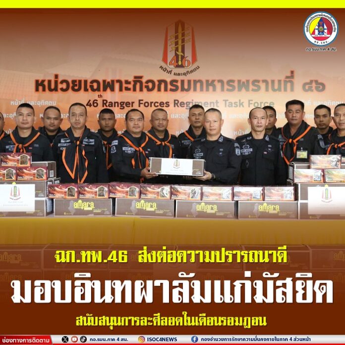 วันที่ 25 กุมภาพันธ์ 2568 เวลา 15.30 น. ณ กองบังคับการ หน่วยเฉพาะกิจกรมทหารพรานที่ 46 (วัดสวนธรรม) หมู่ที่ 2 ตำบลรือเสาะออก อำเภอรือเสาะ จังหวัดนราธิวาส พันเอกสิทธิชัย บำรุงเขต ผู้บังคับหน่วยเฉพาะกิจกรมทหารพรานที่ 46 พร้อมด้วย รองผู้บังคับหน่วยเฉพาะกิจกรมทหารพรานที่ 46 ได้มอบอินทผาลัมให้แก่ ผู้บังคับกองร้อยและกำลังพลของหน่วย เพื่อนำไปแจกจ่ายตามมัสยิดในพื้นที่ เพื่อสนับสนุนการละศีลอดในช่วง เดือนรอมฎอน ฮิจเราะห์ศักราช 1446 ตลอดจนเป็นการแสดงความปรารถนาดีและความจริงใจต่อพี่น้องชาวไทยมุสลิม