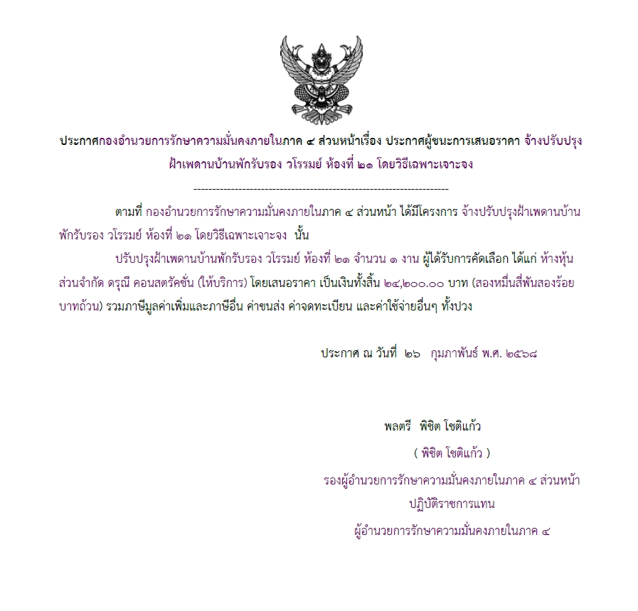 ประกาศผู้ขนะการเสนอราคา จ้างปรับปรุง ฝ้าเพดานบ้านพักรับรอง วโรรมย์ ห้องที่ ๒๑ โดยวิธีเฉพาะเจาะจง