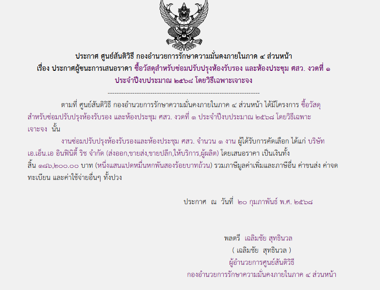 จัดซื้อ จัดจ้างประกาศผู้ชนะการเสนอราคา ประกาศผู้ชนะการเสนอราคา ซื้อวัสดุสำหรับซ่อมปรับปรุงห้องรับรอง และห้องประชุม ศสว. งวดที่ ๑ ประจำปิ๊งบประมาณ ๒๕๖๖๘ โดยวิธีเฉพาะเจาะจง February 26, 2025 233 Share Facebook Twitter Google+ Telegram LINE