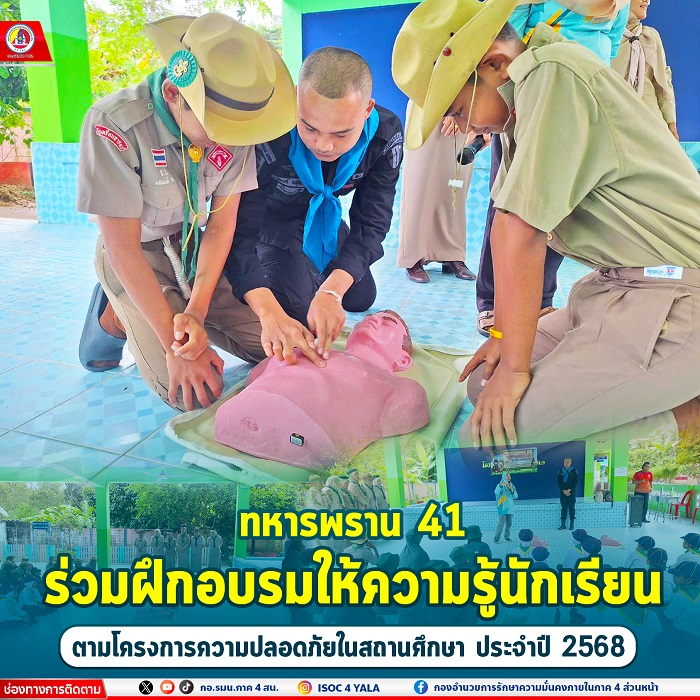 Pada 26 Februari 2568, pukul 1:00 petang, Pasukan Gerakan Am 41 yang diketuai oleh Komander Skuadron 4103 bersama dengan anggota pasukan operasi perkhidmatan awam dan kakitangan Hospital Kesihatan Kampung Galo, bekerjasama dengan Pengarah Sekolah dan para guru, telah mengadakan aktiviti latihan memberi pengetahuan kepada pelajar di bawah program “Keselamatan di Sekolah” untuk Tahun 2568 di Sekolah Tharae, Kampung Bah Ho, Mukim 1, Kampung Galo, Daerah Raman, Negeri Yala. Latihan ini memberi fokus kepada penyelamatan kecemasan pertama untuk meningkatkan pengetahuan dan kemahiran dalam membantu mangsa kejadian kecemasan, supaya pelajar dapat menggunakan pengetahuan yang diperoleh dengan betul dan selamat dalam situasi sebenar. Selain itu, ia juga bertujuan untuk memperkukuhkan keupayaan golongan muda di kawasan ini serta meningkatkan kualiti hidup masyarakat di Negeri Yala secara mampan.