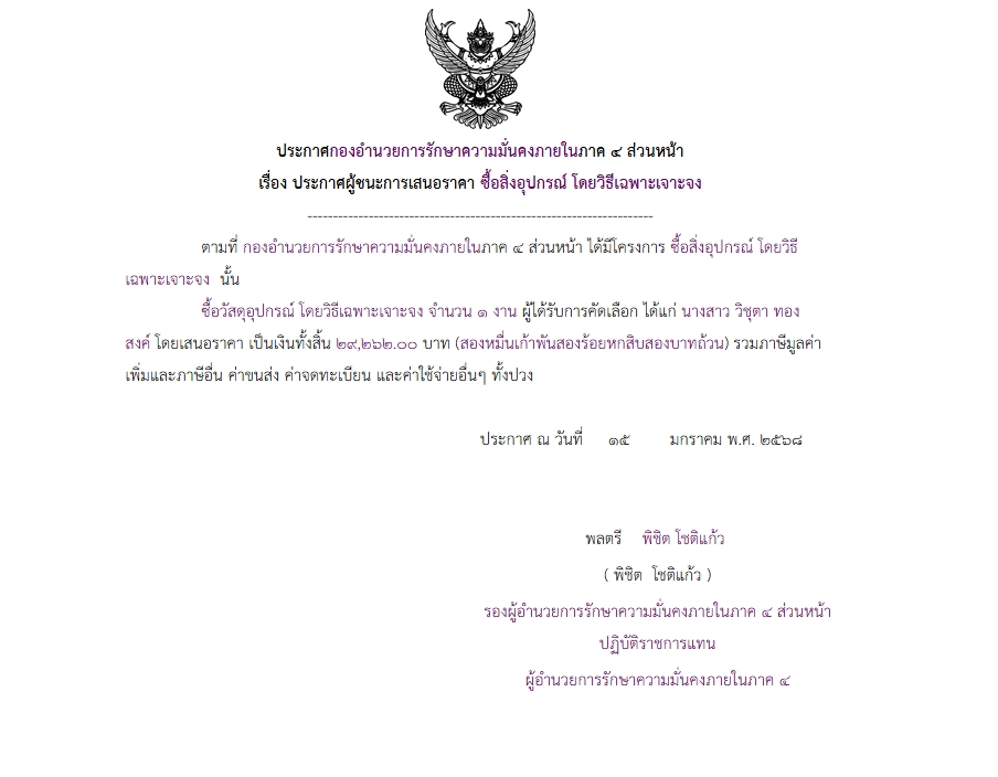 ประกาศผู้ชนะการเสนอราคา ซื้อสิ่งอุปกรณ์ โดยวิธีเลพาะเจาะจง