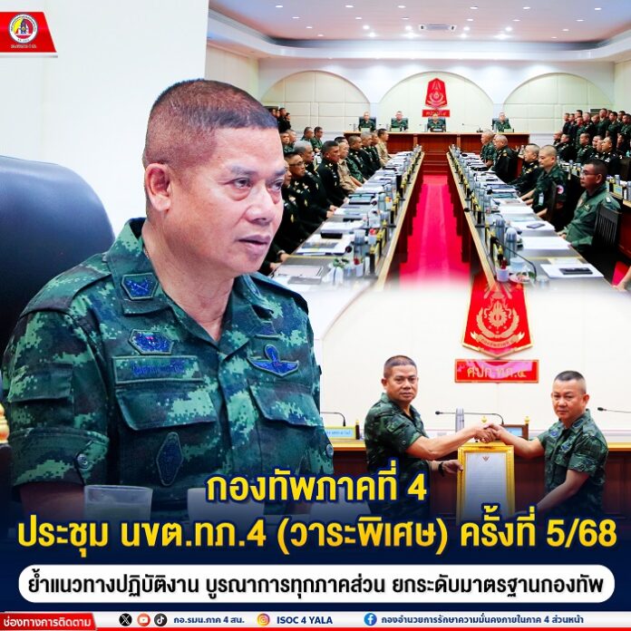 On February 27, 2568, General Phayasan NuSang, the Commander of the 4th Army Area / Director of Internal Security for the 4th Area, presided over the meeting of subordinate units of the 4th Army Area (Special Agenda) at the battalion level, the 5th meeting of 2568, at the Wachirawut Camp. The meeting aimed to follow up on the progress of the plans, with commanders and relevant personnel in attendance.