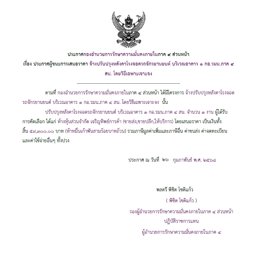 จัดซื้อ จัดจ้างประกาศผู้ชนะการเสนอราคา ประกาศผู้ชนะการเสนอราคา จ้างปรับปรุงหลังคาโรงจอดรถจักรยานยนต์ บริเวณอาคาร ๑ กอ.รมม.กาค ๕ สน. โดยวิธีเฉพาะเจาะจง February 27, 2025 293 Share Facebook Twitter Google+ Telegram LINE
