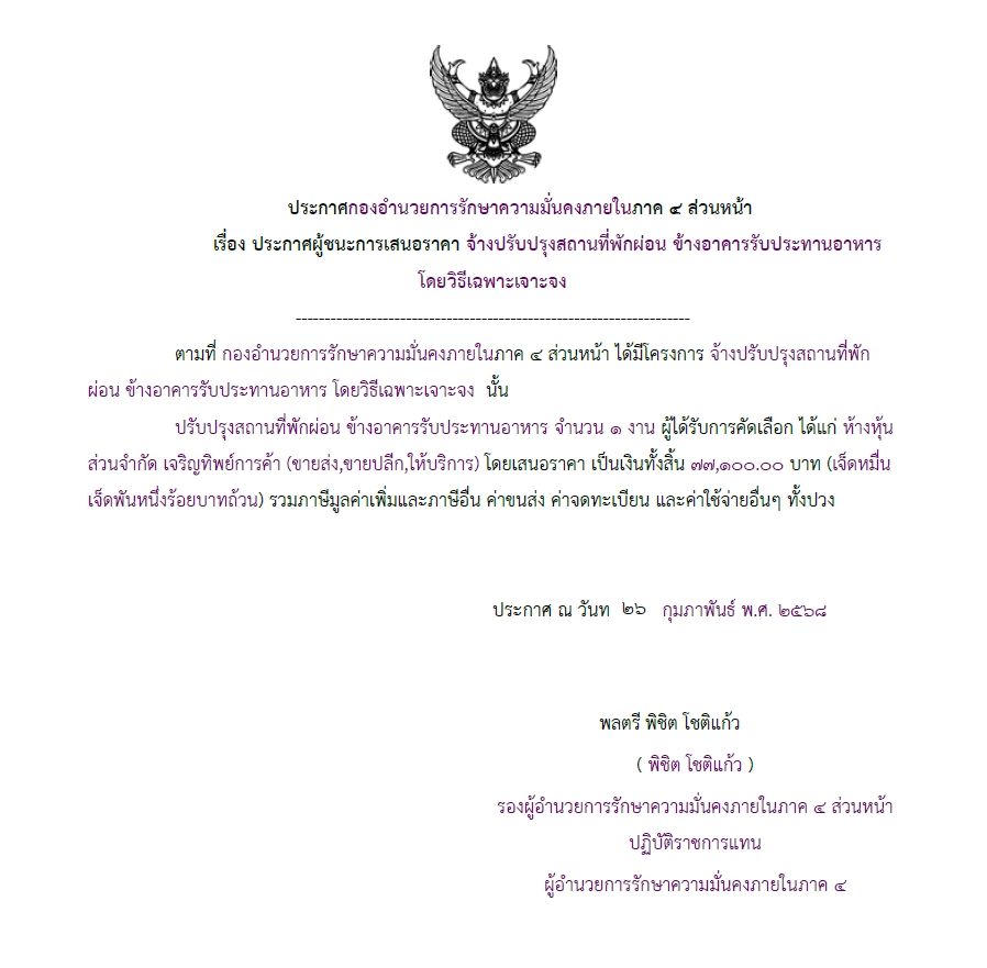 ประกาศผู้ชนะการเสนอราคา จ้างปรับปรุงสถานที่พักผ่อน ข้างอาคารรับประทานอาหาร โดยวิธีเฉพาะเจาะจง