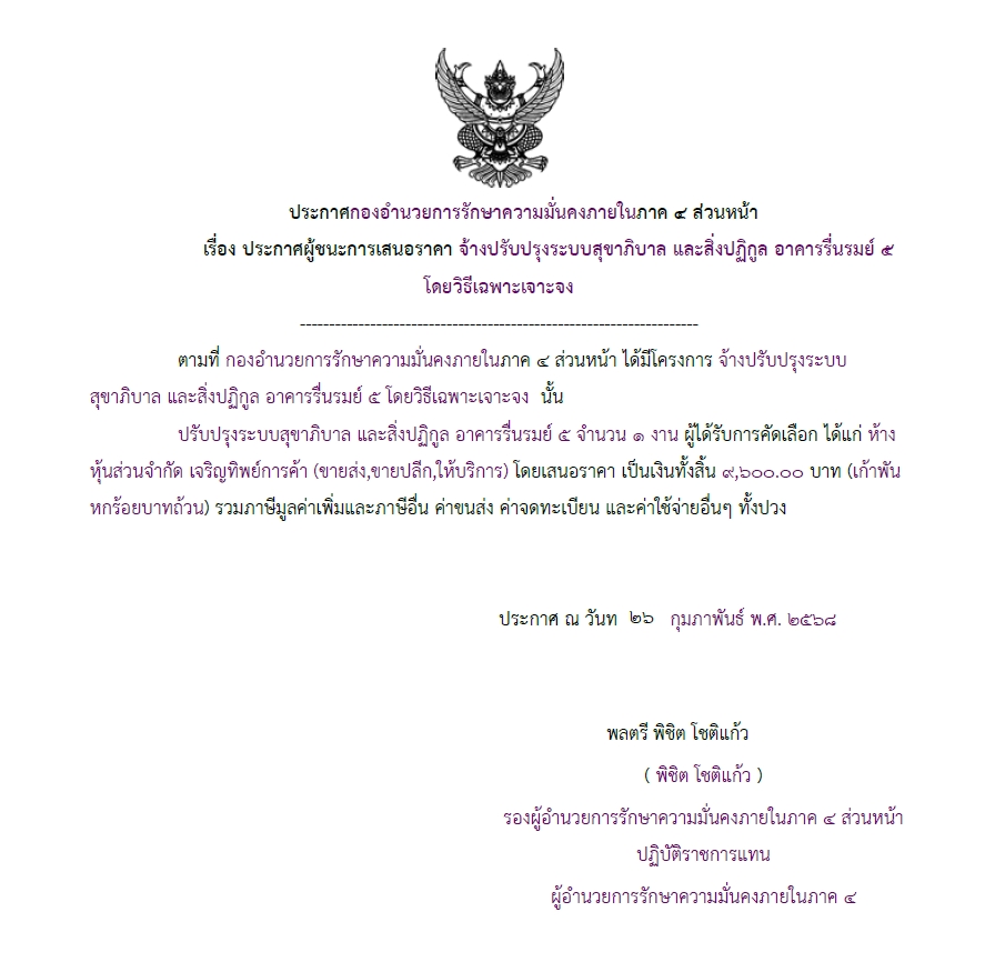 ประกาศผู้ชนะการเสนอราคา จ้างปรับปรุงระบบสุขาภิบาล และสิ่งปฏิกูล อาคารรื่นรมย์ ๕ โดยวิธีเฉพาะเจาะจง