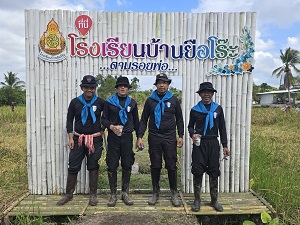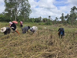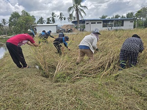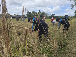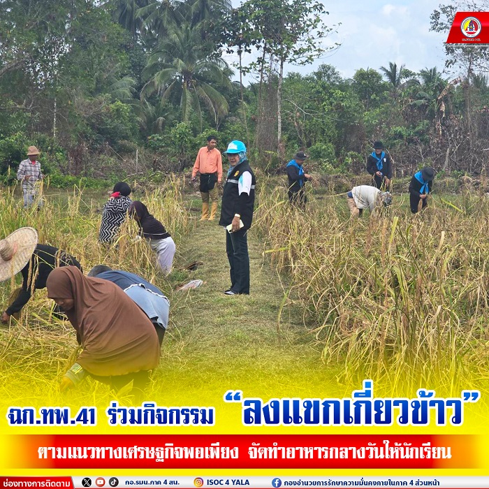 วันที่ 27 กุมภาพันธ์ 2568 เวลา 13.30 น. หน่วยเฉพาะกิจกรมทหารพรานที่ 41 จัดกำลังพลชุดปฏิบัติการกิจการพลเรือน กองร้อยทหารพรานที่ 4111 ร่วมกับ หัวหน้าส่วนราชการ, ผู้นำท้องที่, ผู้นำท้องถิ่น และประชาชนในพื้นที่ ร่วมกิจกรรม “ลงแขกเกี่ยวข้าว” ตามโครงการแนวทางพระราชดำริเศรษฐกิจพอเพียง ณ แปลงนาหลังโรงเรียนบ้านยือโร๊ะ หมู่ที่ 2 ตำบลบาโงย อำเภอรามัน จังหวัดยะลา ซึ่งกิจกรรมในครั้งนี้เพื่อส่งเสริมการพึ่งพาตนเองของชุมชน และนำผลผลิตที่ได้ไปจัดทำเป็นอาหารกลางวันให้กับนักเรียนในพื้นที่ ตอกย้ำแนวคิดการใช้ทรัพยากรอย่างคุ้มค่า และสร้างความเข้มแข็งให้แก่ชุมชน