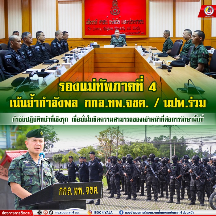 Today (March 1, 2568) at 09:00 AM, at the Southern Border Patrol Task Force Headquarters, Ingkayuthabhirak Camp, Bo Thong Subdistrict, Nong Jik District, Pattani Province, Major General Woradet Decharaksa, Deputy Commander of the 4th Army Area / Deputy Director of Internal Security Operations Area 4 Forward, along with his team, visited to monitor the task execution and provide guidance to the personnel of the Southern Border Patrol Task Force / Joint Special Operations Unit. Colonel Sathiraphong Achan, the Commander of the Southern Border Patrol Task Force, the Deputy Commander of the Southern Border Patrol Task Force, and officers from the Joint Special Operations Unit in Yala, Pattani, and Narathiwat provinces, as well as the Joint Special Operations Unit, welcomed the team and participated in the meeting.